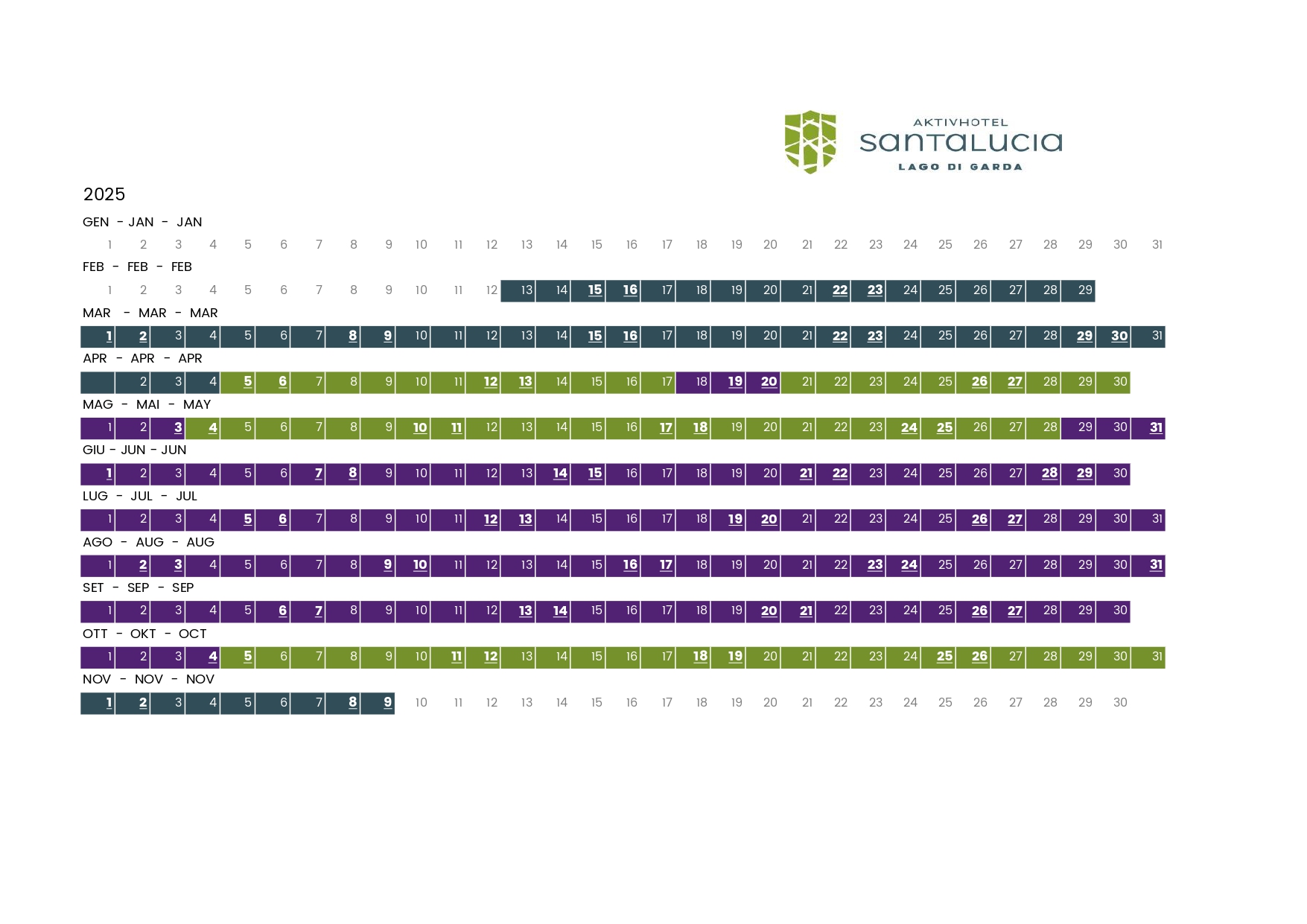 Das ist die Devise im AktivHotel SantaLucia. Denn die Aufenthaltspreise sind dynamisch und variieren je nach Zeitraum. Das bedeutet: Wer länger bleibt, spart. Und wer früher bucht, spart auch! Die Details findet ihr im untenstehenden Kalender.