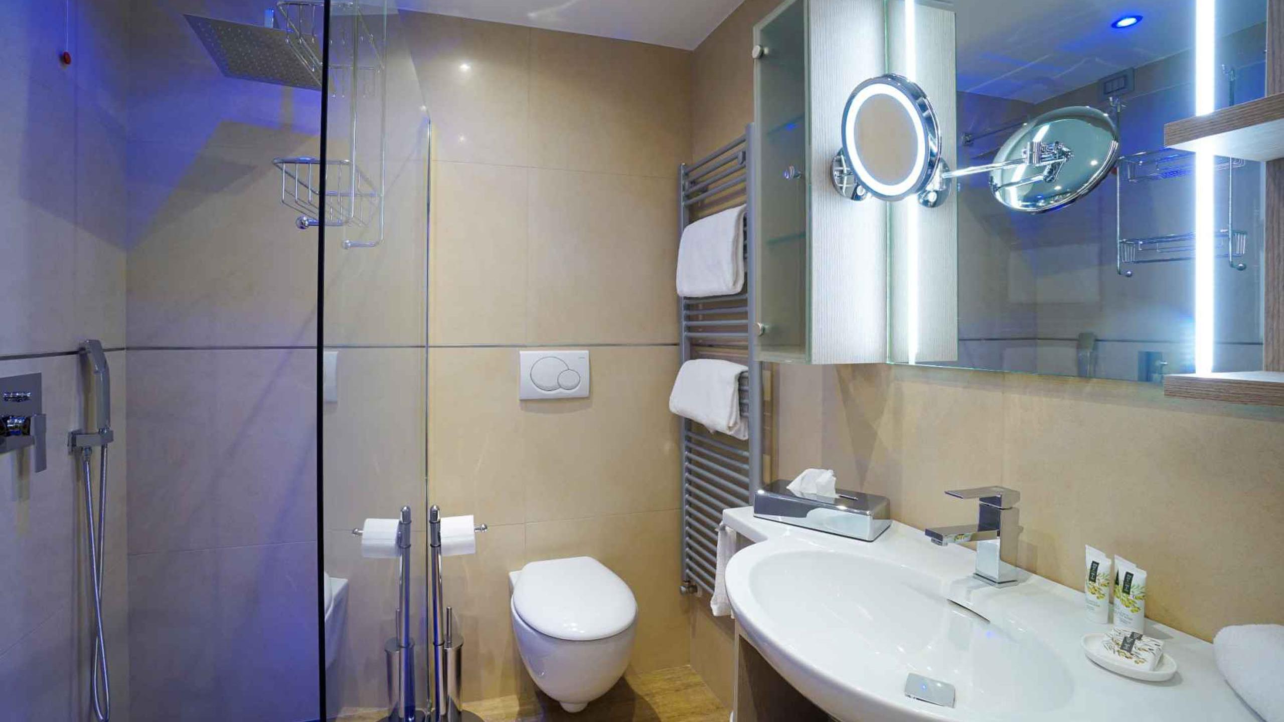- Bad mit Dusche, weichen Baumwollhandtüchern und Spendern mit umweltfreundlichen Pflegeprodukten