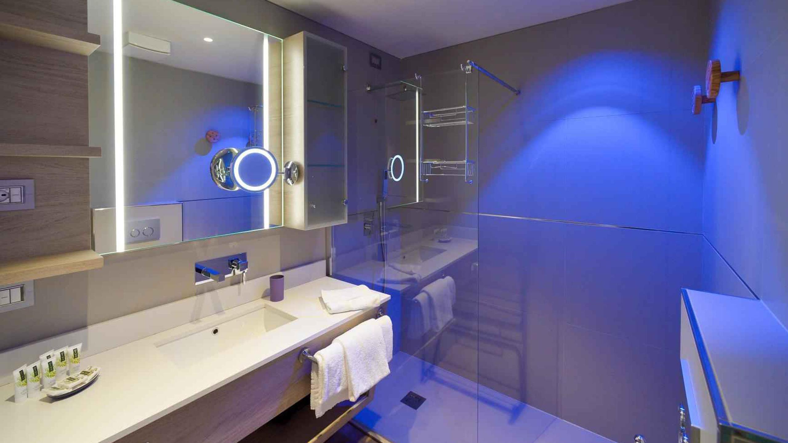 - Bad mit Dusche, weichen Baumwollhandtüchern und Spendern mit umweltfreundlichen Pflegeprodukten